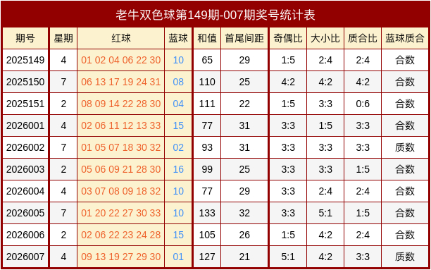 当期红球号码大小比为4:2,三区比为1:2:3,奇偶比为5:1。蓝球开出少量奇数球01。 老牛最近10期红球奖号走势分析