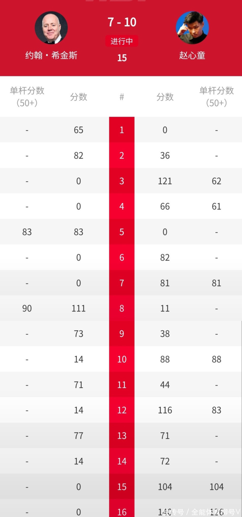 赵心童与艾伦的这场比赛,敌手输的心折口服,数据方面:36-77, 59-36, 27-107 (107), 40-63 (55),140-0 (140), 0-114 (65), 104-16 (103),102-0 (58), 6-97 (90), 81-8 (53), 105-14 (56)。 另一场半决赛,4届世锦赛冠军希金斯,则以6-5投诚全国第一特鲁姆普。数据方面:71-26 (71), 100-1 (57), 82-5 (76), 20-70, 71-28,21-68, 1-72, 64-21, 52-68 (68), 62-67, 71-44 (65)。